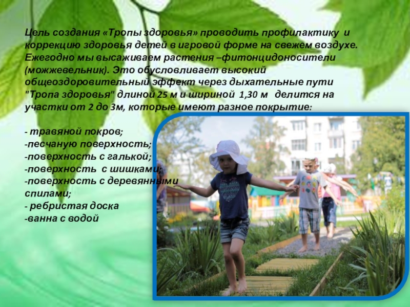 игровой форме на свежем воздухе. Ежегодно мы высаживаем растения –фитонцидоносители (можжевельник). Это обусловливает высокий общеоздоровительный эффект через дыхательные пути