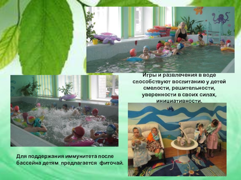 Слайд 21Игры и развлечения в воде способствуют воспитанию у детей смелости, решительности,
