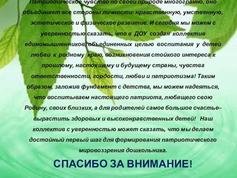 личности: нравственную, умственную, эстетическое и физическое развитие. И сегодня мы можем с уверенностью сказать, что в ДОУ создан коллектив единомышленников, объединенных целью воспитания у детей любви к родному краю, возникновения стойкого интереса к прошлому, настоящему и будущему страны, чувства ответственности, гордости, любви и патриотизма! Таким образом, заложив фундамент с детства, мы можем надеяться, что воспитываем настоящего патриота, любящего свою Родину, своих близких, а для родителей самое большое счастье– вырастить здоровых и высоконравственных детей! Наш коллектив с уверенностью может сказать, что мы делаем достойный первый шаг для формирования патриотического мировоззрения дошкольника.