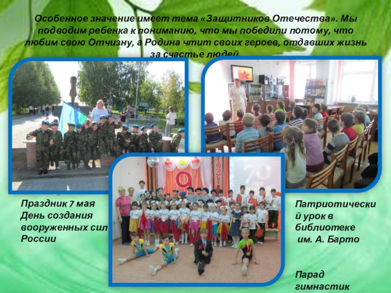 Слайд 24Особенное значение имеет тема «Защитников Отечества». Мы подводим ребенка к пониманию,