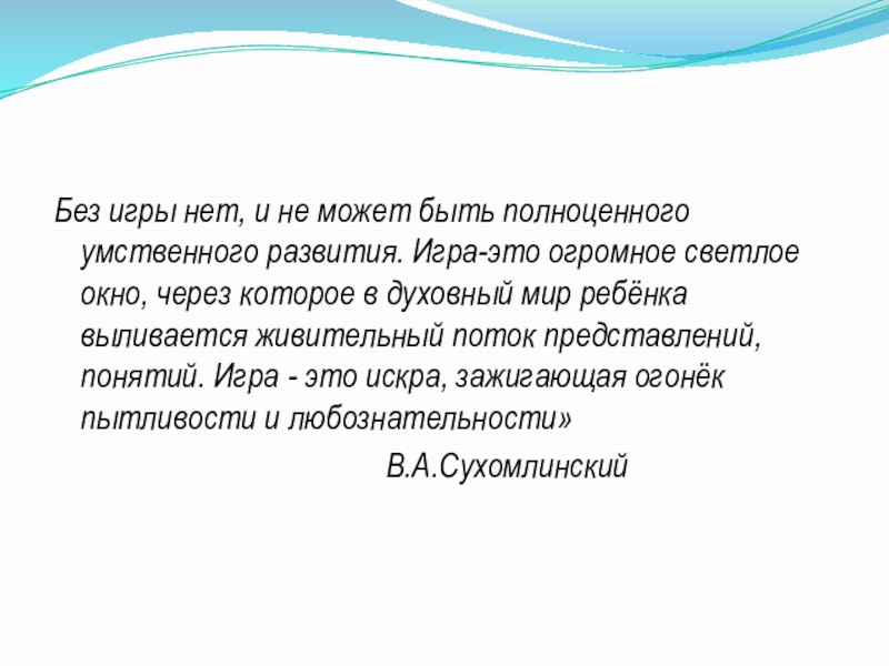 умственного развития. Игра-это огромное светлое окно, через которое в духовный мир ребёнка выливается живительный поток представлений, понятий. Игра - это искра, зажигающая огонёк пытливости и любознательности»