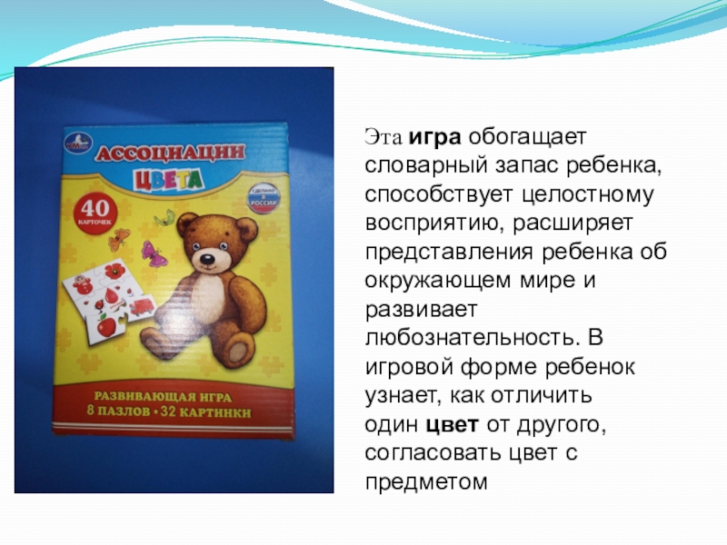 Слайд 25Эта игра обогащает словарный запас ребенка, способствует целостному восприятию, расширяет представления ребенка об