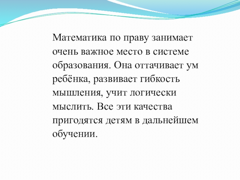 Слайд 30Математика по праву занимает очень важное место в системе образования. Она