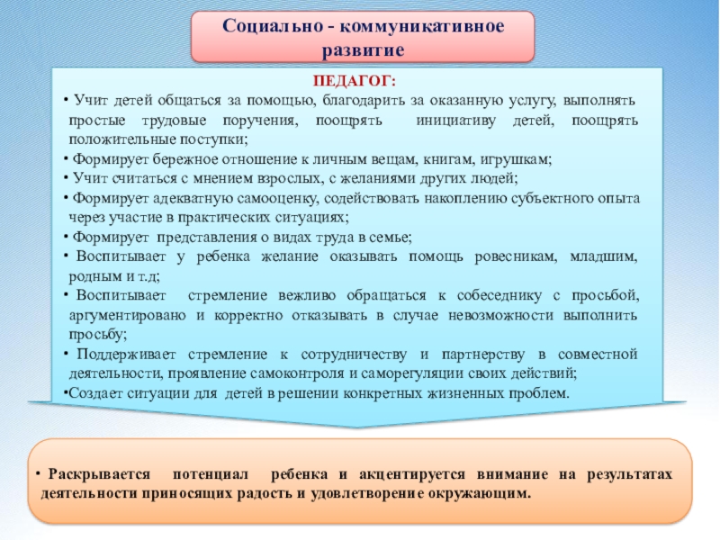 Учит детей общаться за помощью, благодарить за оказанную услугу, выполнять простые трудовые поручения, поощрять инициативу детей, поощрять положительные поступки;