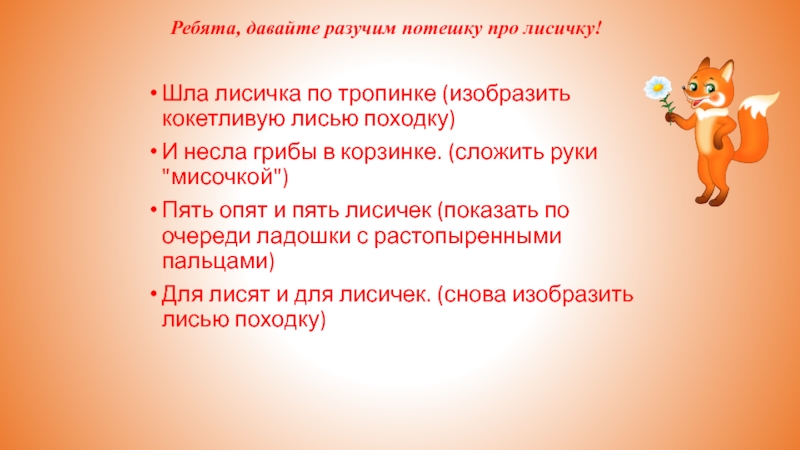 Шла лисичка по тропинке (изобразить кокетливую лисью походку)