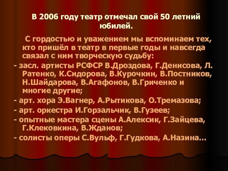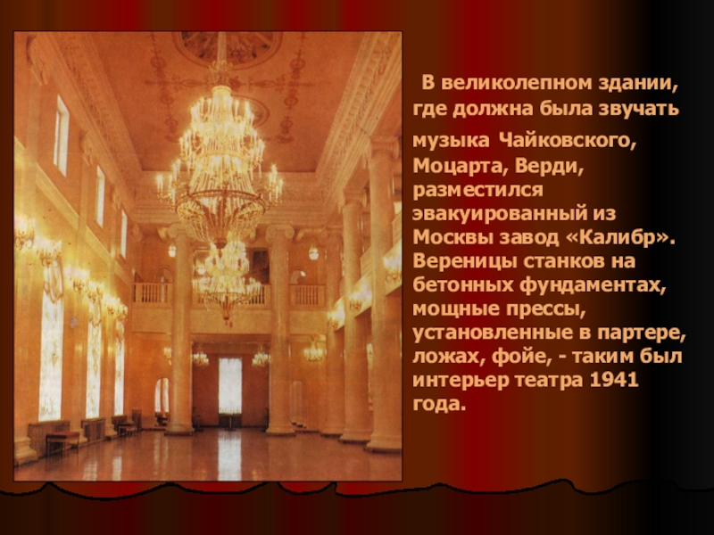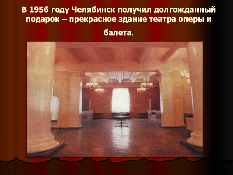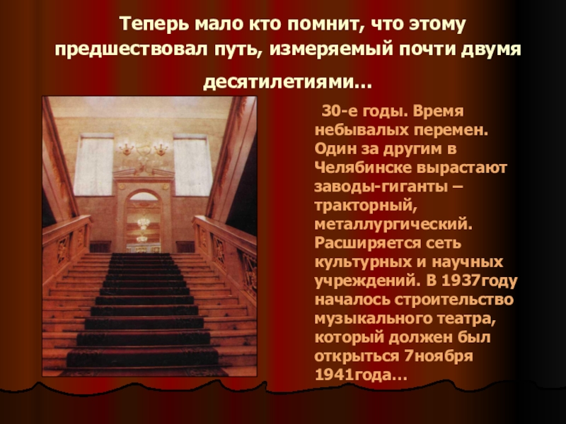 30-е годы. Время небывалых перемен. Один за другим в Челябинске вырастают заводы-гиганты – тракторный, металлургический. Расширяется сеть культурных и научных учреждений. В 1937году началось строительство музыкального театра, который должен был открыться 7ноября 1941года…