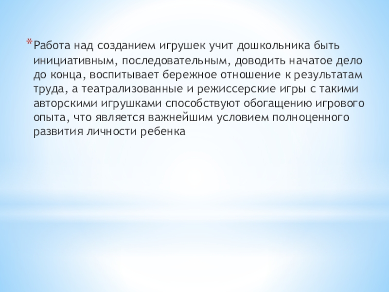Слайд 8Работа над созданием игрушек учит дошкольника быть инициативным, последовательным, доводить начатое