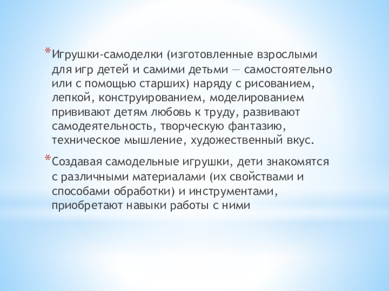 Слайд 4Игрушки-самоделки (изготовленные взрослыми для игр детей и самими детьми — самостоятельно