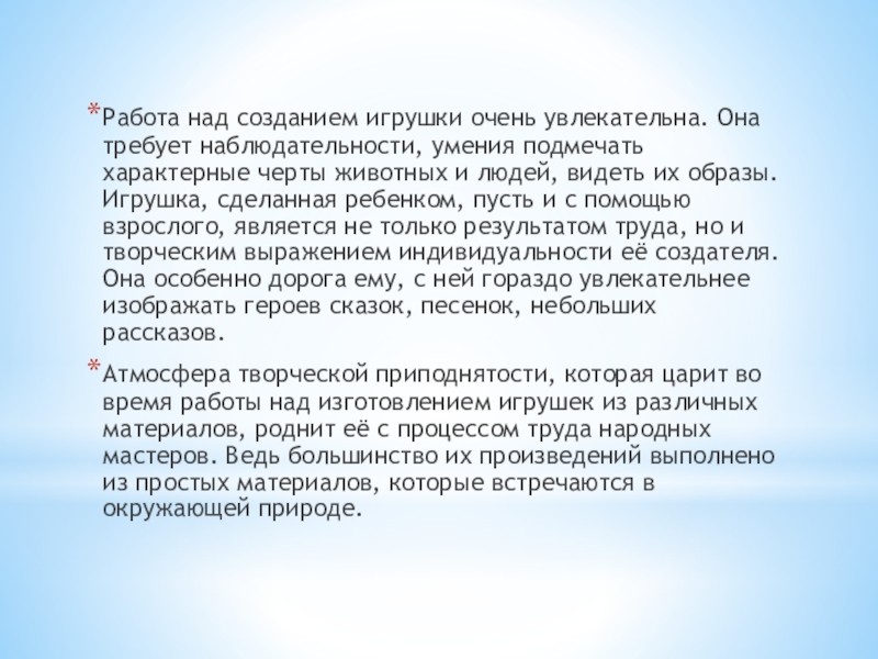 Слайд 6Работа над созданием игрушки очень увлекательна. Она требует наблюдательности, умения подмечать