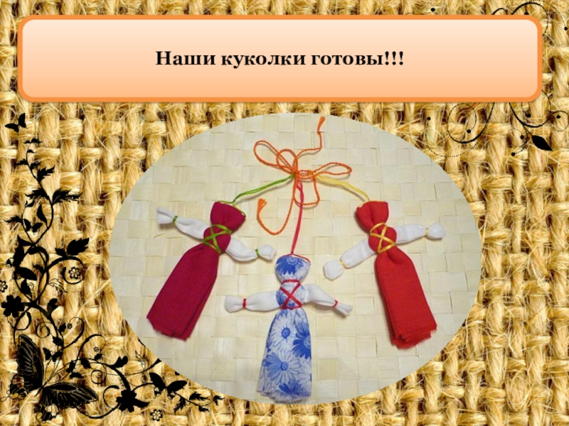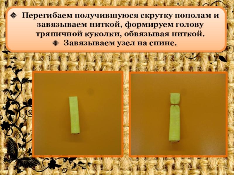 Слайд 4Перегибаем получившуюся скрутку пополам и завязываем ниткой, формируем голову тряпичной куколки,