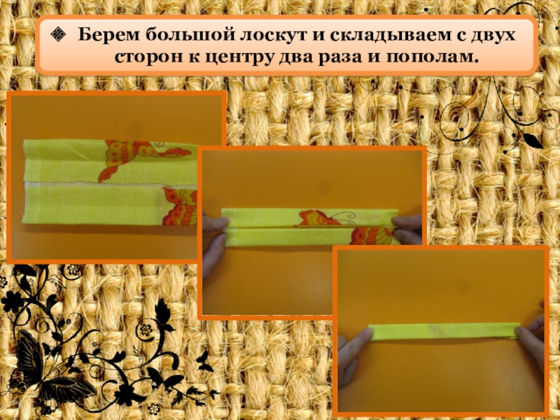Слайд 3Берем большой лоскут и складываем с двух сторон к центру два