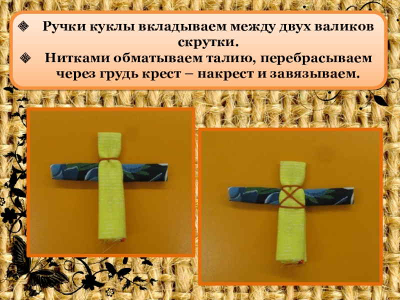 Слайд 6Ручки куклы вкладываем между двух валиков скрутки.
