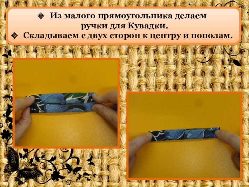 Из малого прямоугольника делаем ручки для Кувадки. Складываем с двух сторон к центру и пополам.