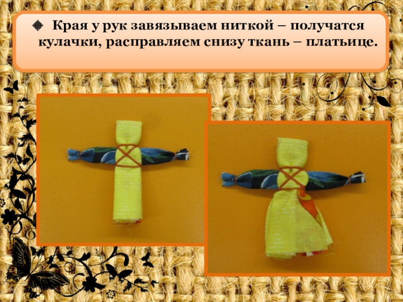 Слайд 7Края у рук завязываем ниткой – получатся кулачки, расправляем снизу ткань