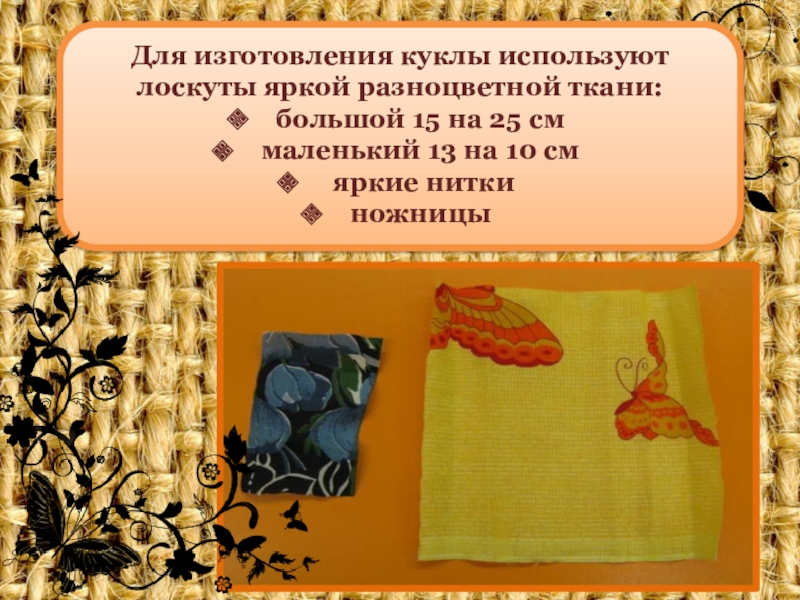 Слайд 2Для изготовления куклы используют лоскуты яркой разноцветной ткани: