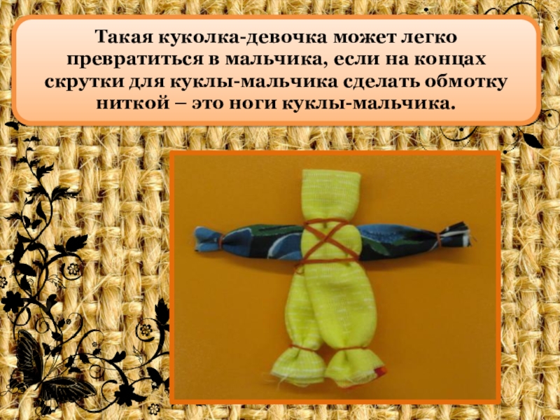 Слайд 8Такая куколка-девочка может легко превратиться в мальчика, если на концах скрутки