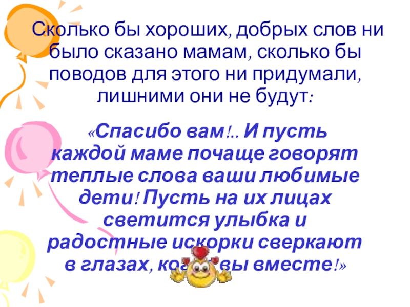 «Спасибо вам!.. И пусть каждой маме почаще говорят теплые слова ваши любимые дети! Пусть на их лицах светится улыбка и радостные искорки сверкают в глазах, когда вы вместе!»