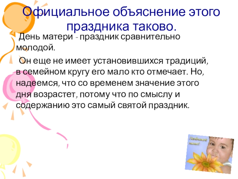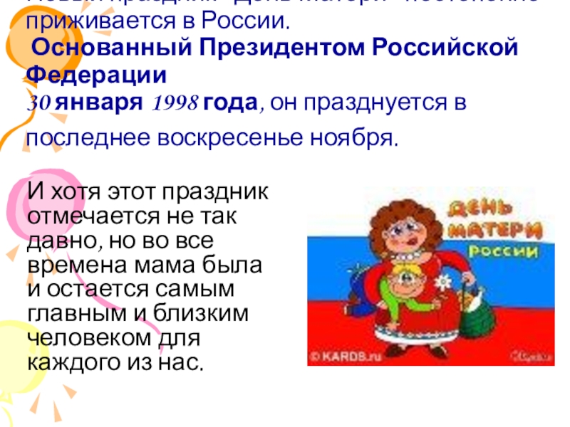 И хотя этот праздник отмечается не так давно, но во все времена мама была и остается самым главным и близким человеком для каждого из нас.