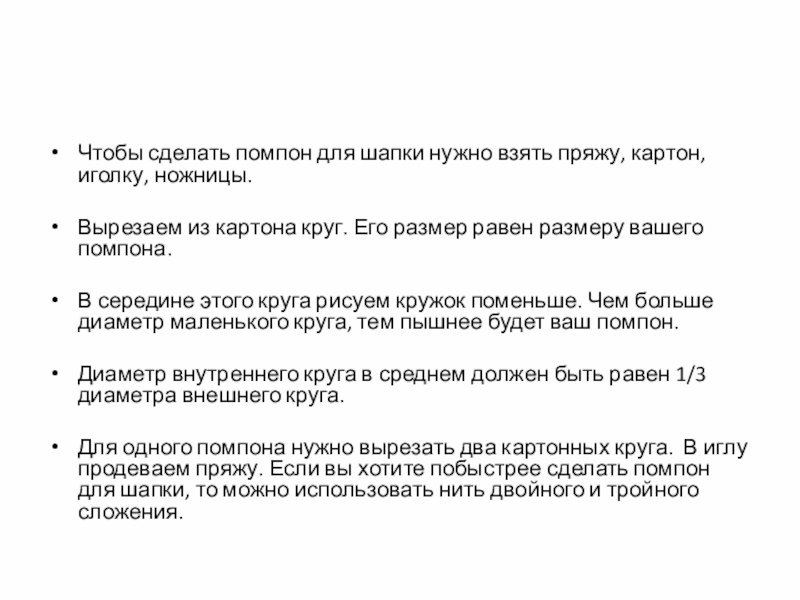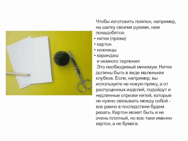 Слайд 6Чтобы изготовить помпон, например, на шапку своими руками, нам понадобятся: