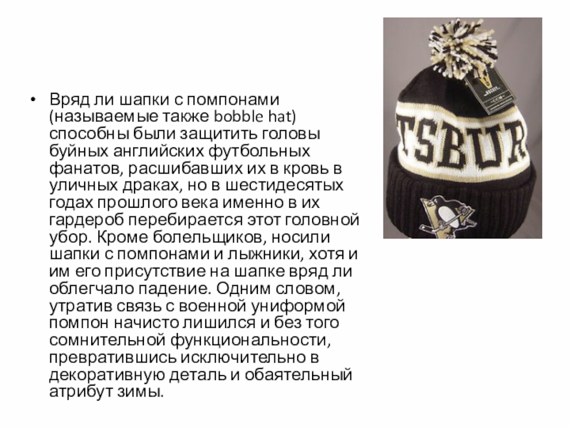 Слайд 4Вряд ли шапки с помпонами (называемые также bobble hat) способны были