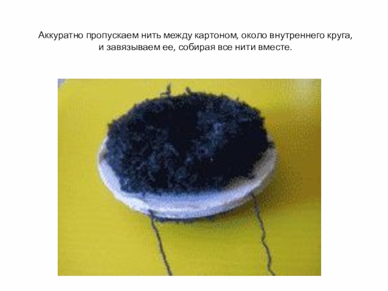 Слайд 10Аккуратно пропускаем нить между картоном, около внутреннего круга,