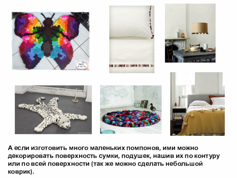 Слайд 14А если изготовить много маленьких помпонов, ими можно декорировать поверхность сумки,