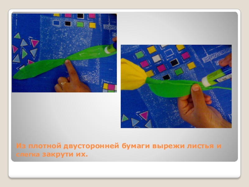 Слайд 6Из плотной двусторонней бумаги вырежи листья и слегка закрути их.