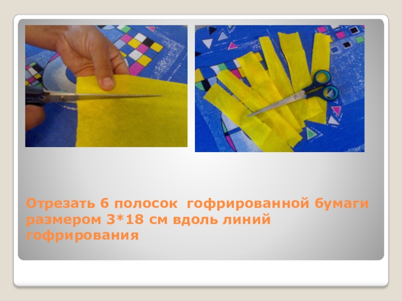 Слайд 2Отрезать 6 полосок гофрированной бумаги размером 3*18 см вдоль линий гофрирования