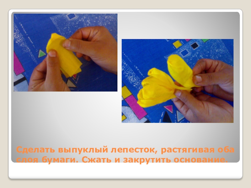 Слайд 4Сделать выпуклый лепесток, растягивая оба слоя бумаги. Сжать и закрутить основание.