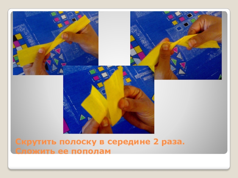 Слайд 3Скрутить полоску в середине 2 раза. Сложить ее пополам