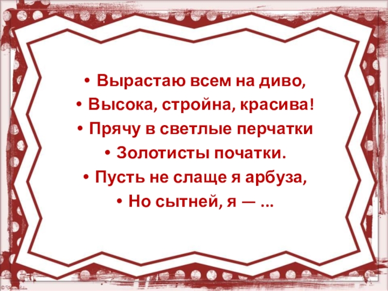 Вырастаю всем на диво,Высока, стройна, красива!Прячу в светлые перчаткиЗолотисты початки.Пусть не слаще я арбуза,Но сытней, я —