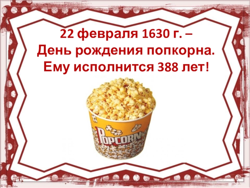 Слайд 1022 февраля 1630 г. – День рождения попкорна. Ему исполнится 388 лет!
