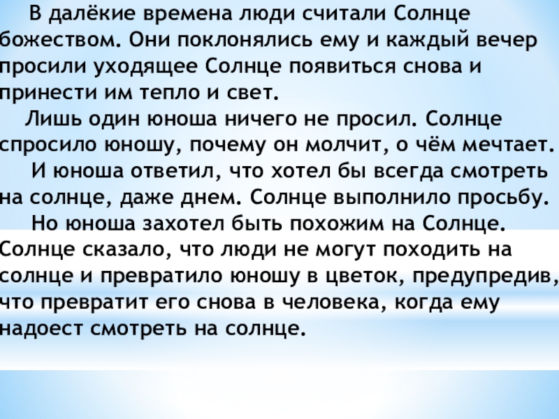 ему и каждый вечер просили уходящее Солнце появиться снова и принести им тепло и свет. Лишь один юноша ничего не просил. Солнце спросило юношу, почему он молчит, о чём мечтает. И юноша ответил, что хотел бы всегда смотреть на солнце, даже днем. Солнце выполнило просьбу. Но юноша захотел быть похожим на Солнце. Солнце сказало, что люди не могут походить на солнце и превратило юношу в цветок, предупредив, что превратит его снова в человека, когда ему надоест смотреть на солнце.