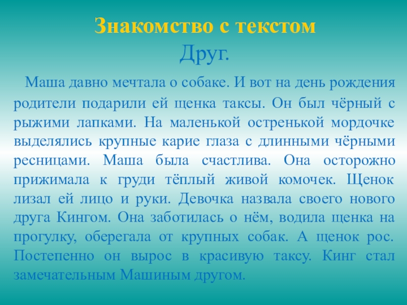 Знакомство с текстомДруг. Маша давно мечтала о собаке. И вот на день рождения родители подарили ей щенка
