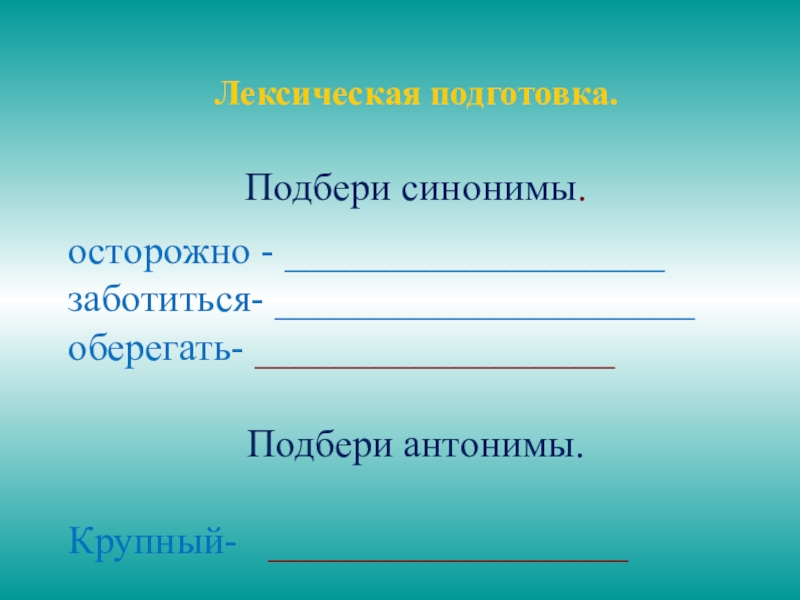 Лексическая подготовка.Подбери синонимы.осторожно - ___________________заботиться- _____________________оберегать- __________________Подбери антонимы.Крупный- 	__________________