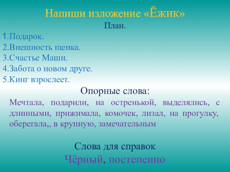 Напиши изложение «Ёжик» План.Подарок.Внешность щенка.Счастье Маши.Забота о новом друге.Кинг взрослеет.Опорные слова:Мечтала, подарили, на остренькой, выделялись, с длинными,