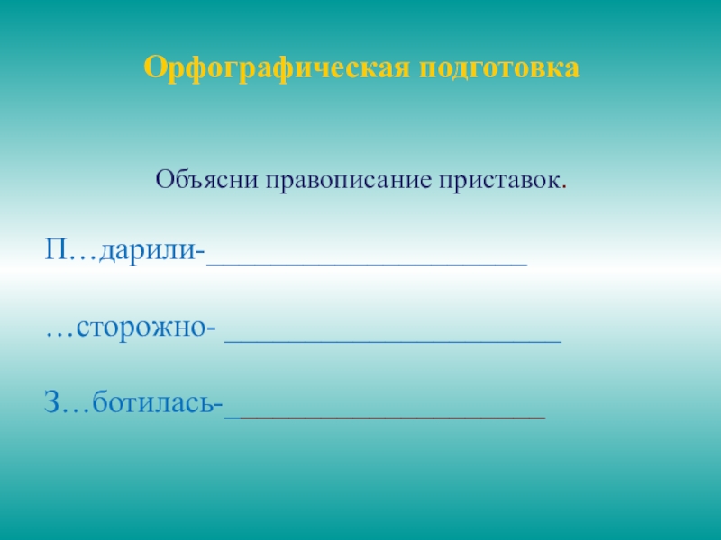 Орфографическая подготовкаОбъясни правописание приставок.П…дарили-____________________…сторожно- _____________________З…ботилась-____________________