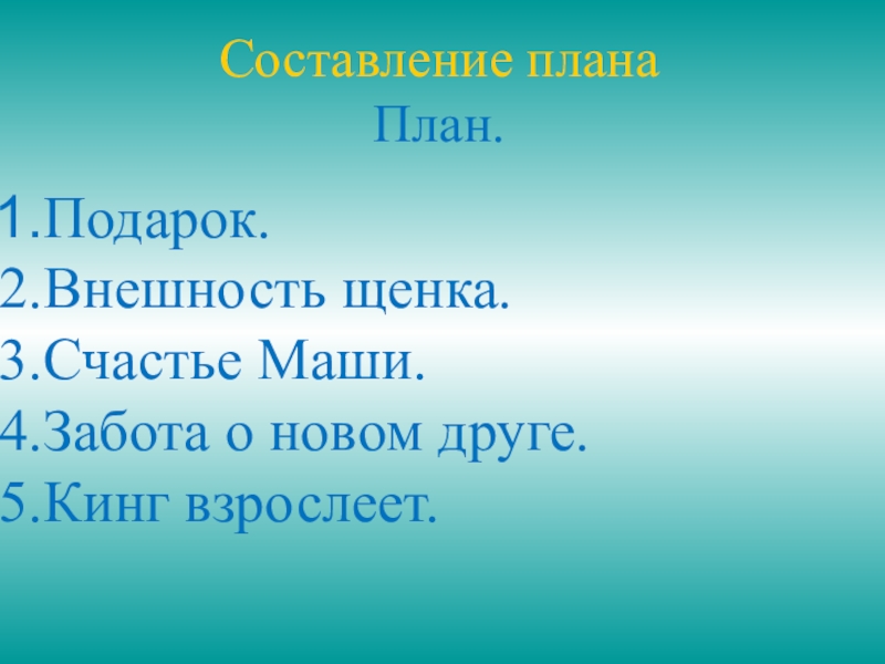 Составление планаПлан.Подарок.Внешность щенка.Счастье Маши.Забота о новом друге.Кинг взрослеет.
