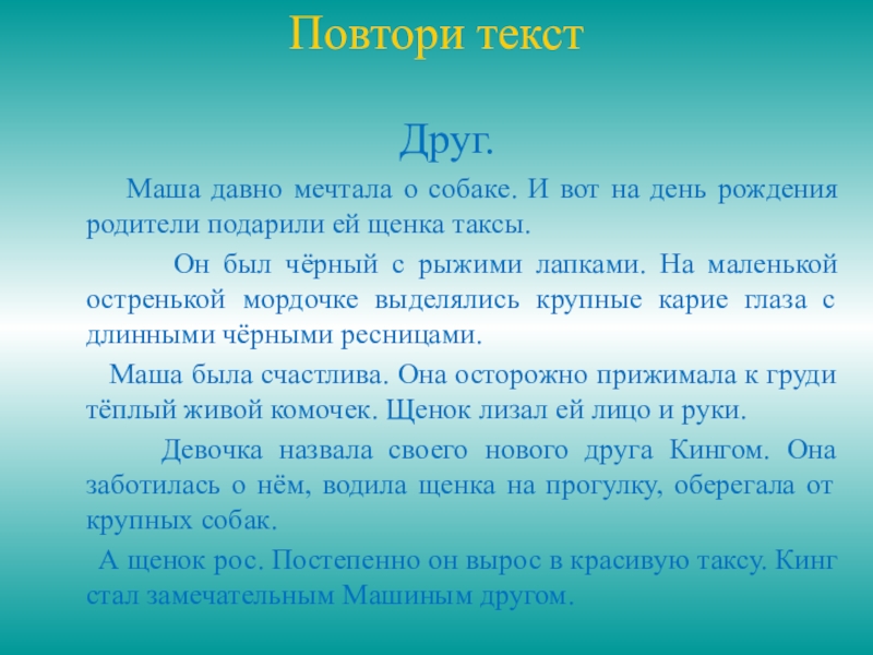 Повтори текст Друг.    Маша давно мечтала о собаке. И вот на день рождения родители