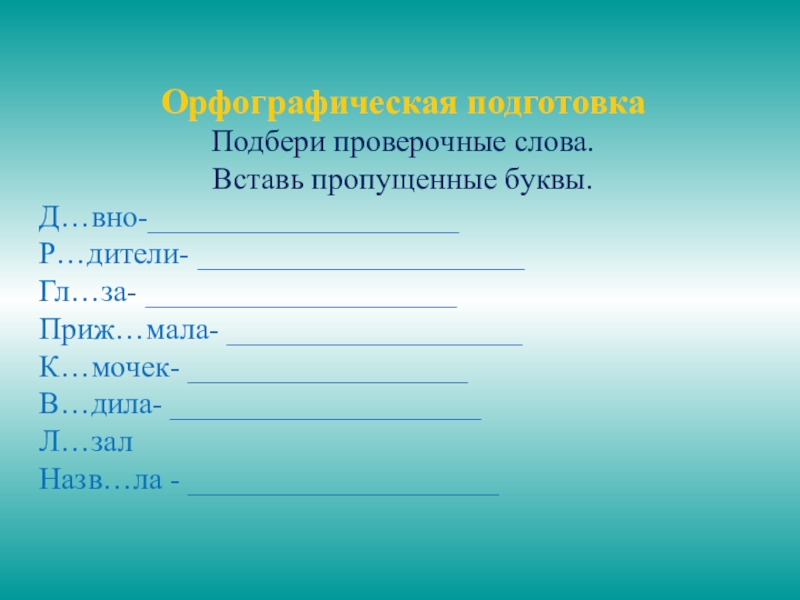 Орфографическая подготовкаПодбери проверочные слова. Вставь пропущенные буквы.Д…вно-____________________Р…дители- _____________________Гл…за- ____________________Приж…мала- ___________________К…мочек- __________________В…дила- ____________________Л…залНазв…ла - ____________________