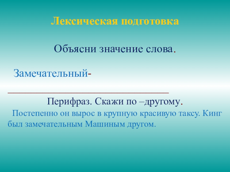 Лексическая подготовка Объясни значение слова. Замечательный- ____________________________Перифраз. Скажи по –другому. Постепенно он вырос в крупную красивую таксу.