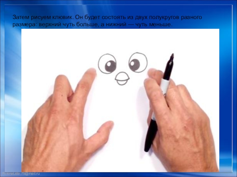Слайд 6Затем рисуем клювик. Он будет состоять из двух полукругов разного размера: