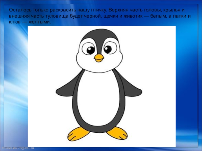 Слайд 13Осталось только раскрасить нашу птичку. Верхняя часть головы, крылья и внешняя