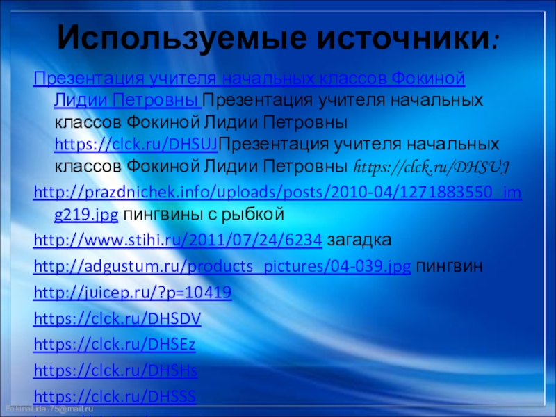 Используемые источники:Презентация учителя начальных классов Фокиной Лидии Петровны Презентация учителя начальных классов Фокиной Лидии Петровны https://clck.ru/DHSUJПрезентация учителя