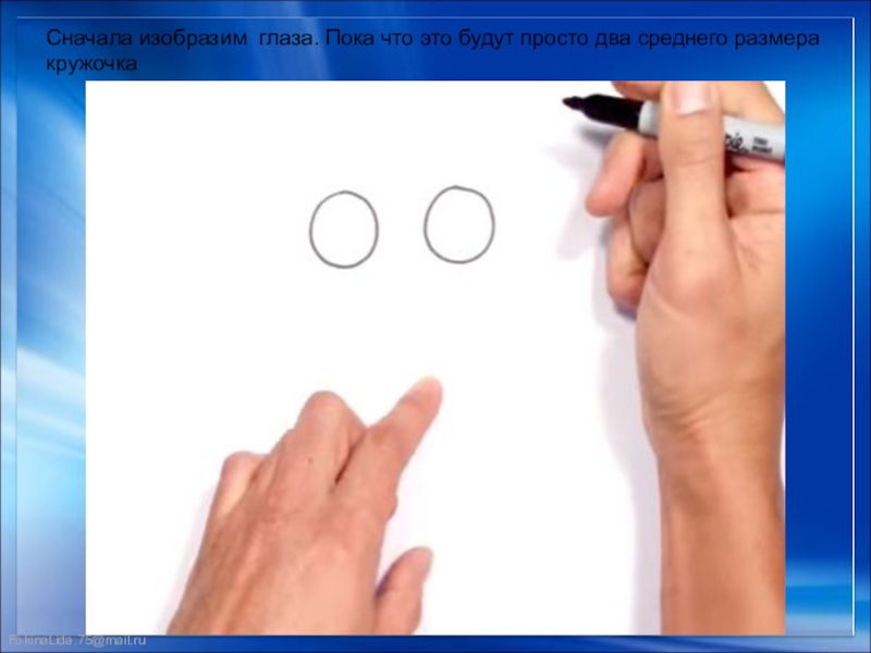 Слайд 4Сначала изобразим  глаза. Пока что это будут просто два среднего размера