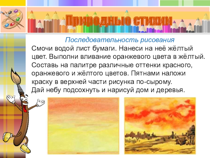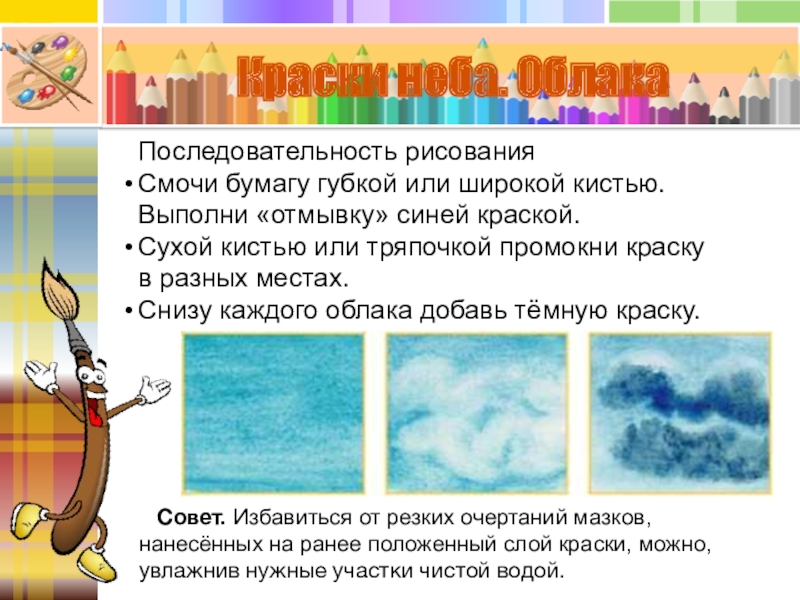 Совет. Избавиться от резких очертаний мазков, нанесённых на ранее положенный слой краски, можно, увлажнив нужные участки чистой водой.