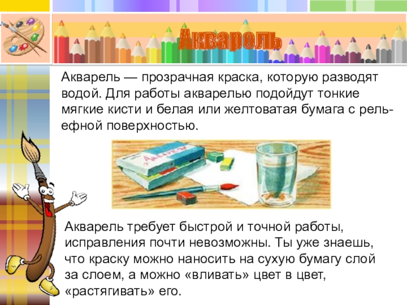 Акварель требует быстрой и точной работы, исправления почти невозможны. Ты уже знаешь, что краску можно наносить на сухую бумагу слой за слоем, а можно «вливать» цвет в цвет, «растягивать» его.
