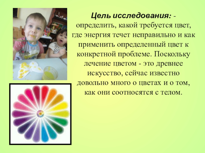 Слайд 3Цель исследования: - определить, какой требуется цвет, где энергия течет неправильно и
