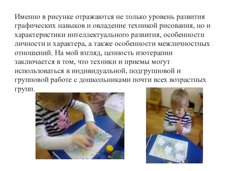 овладение техникой рисования, но и характеристики интеллектуального развития, особенности личности и характера, а также особенности межличностных отношений. На мой взгляд, ценность изотерапии заключается в том, что техники и приемы могут использоваться в индивидуальной, подгрупповой и групповой работе с дошкольниками почти всех возрастных групп.
