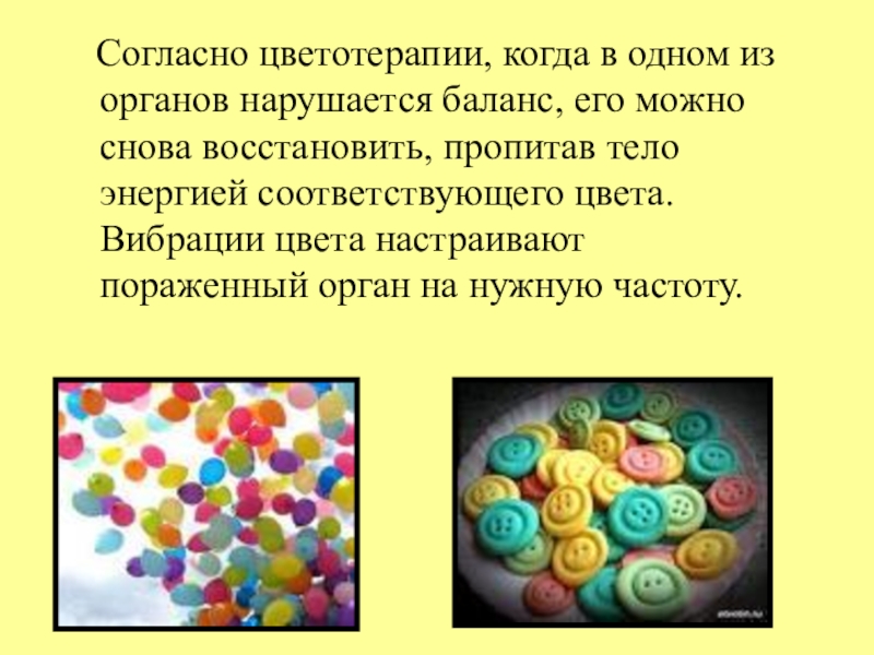 Слайд 8 Согласно цветотерапии, когда в одном из органов нарушается баланс,